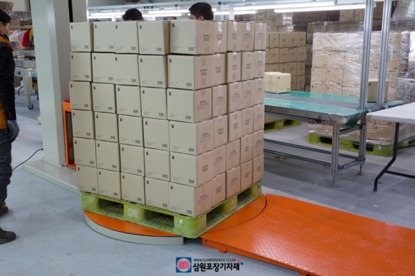 박스포장라인에서 포장된 박스가 컨베어를 타고오면 박스를 올려놓고 랩핑후 출고되는 반자동화 라인입니다.