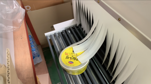 라면용기, 전자레인지 용기를 수축필름에 넣으면 실러나이프가 제품을 사각으로 실링 및 컷팅하게 되는데요
