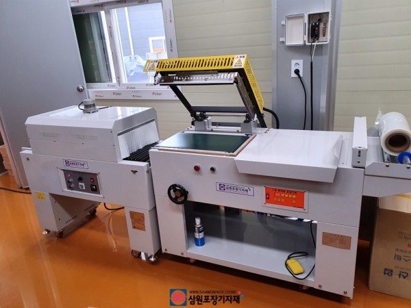 수축터널(왼쪽)과 엘실러(오른쪽)으로 구성된 반자동수축포장기는 다양한 크기의 수축필름을 사용해서 여러 용기를 수축포장할수 있으며