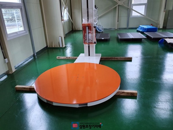 파렛트랩핑기는 턴테이블(회전판) 옆과 기둥 밑으로 지게차로 옮길수 있는 홈이 있어서 필요시 원하는 위치로 옮겨서 사용이 가능합니다.