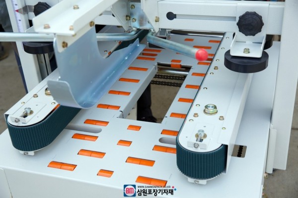 박스의 폭, 높이에 따른 사이즈조절을 핸들로 하는 반자동탭핑기는 삼원포장에서 매주같이 출고될정도로 인기가 많은 포장기계로
