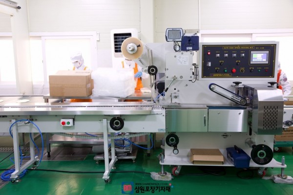 제품크기에 따라 다르지만 분당 50~80pack의 포장이 가능한 삼면포장기는 여러 제품의 포장에 사용되고 있답니다.