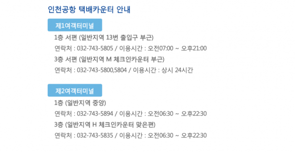 바로 제1여객터미널과 3층 서편(M체크인카운터)과 제2여객터미널 3층(H체크인카운터)에 위치한 한진택배인데요