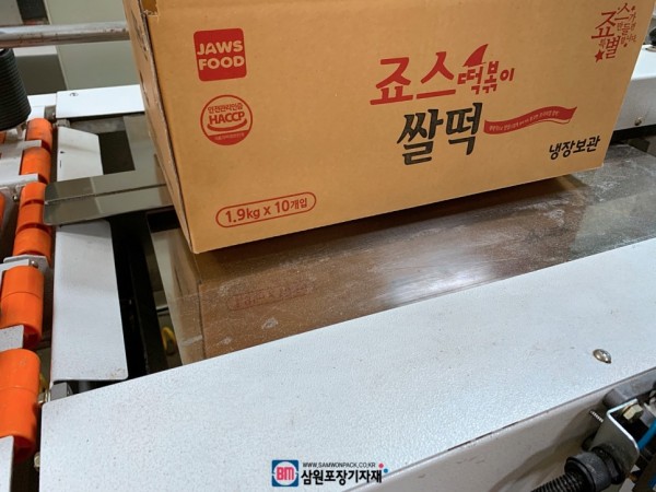 떡볶이떡을 많이 넣고 포장하셔서 작업자가 상부 박스를 접어서 진행시키고 있었습니다