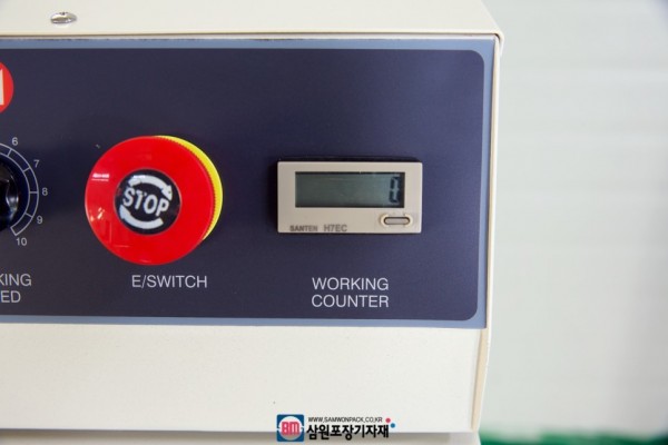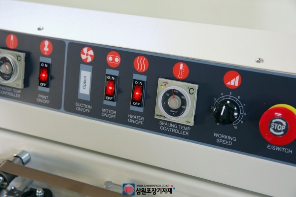 실링기와 인자기의 독립적인 온도조절과 카운터, 컨베어 속도조절, 비상스위치가 달려있는 콘트롤러입니다.