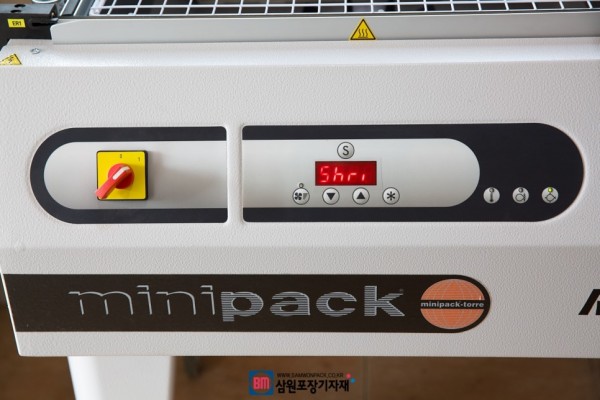 왼쪽의 노브를 돌리면 제품의 전원이 켜지며(220v), 간단한 버튼조작으로 쉽게 사용할수 있는 수축포장기입니다.