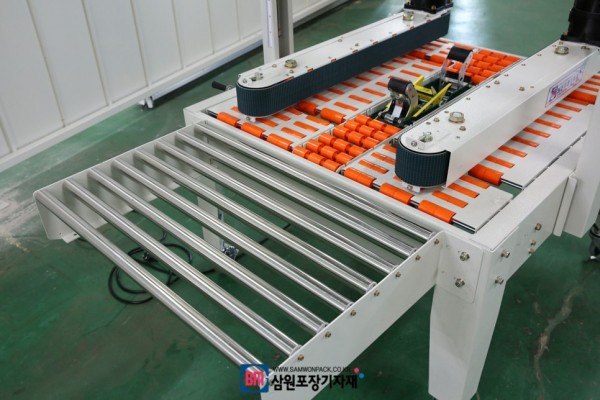 박스에 제품을 담고 컨베어를 타고 이동을 하면 자동으로 박스의 상,하부 테이핑이되고 자바라, 컨베어를 타고 이동