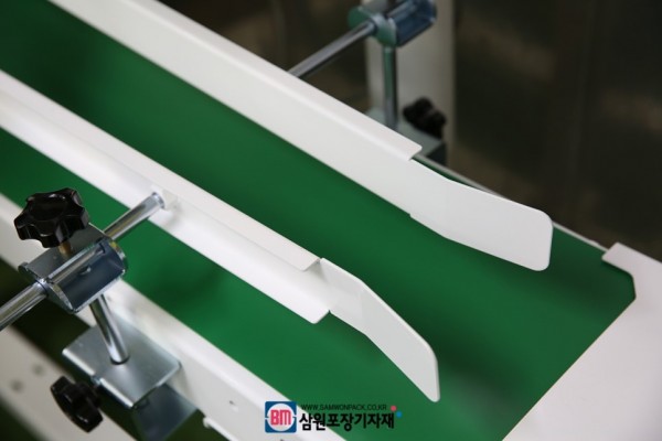 세워놓은 파우치, 지퍼백등이 넘어지지 않고 컨베어에서 이동할수 있게 가이드바(Guide bar)가 설치되어 있습니다(높이, 폭조절가능)