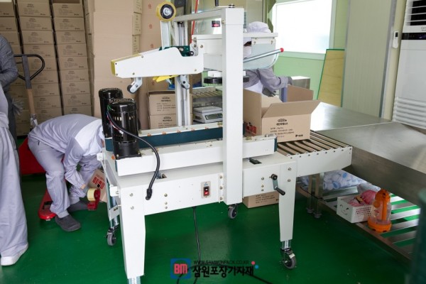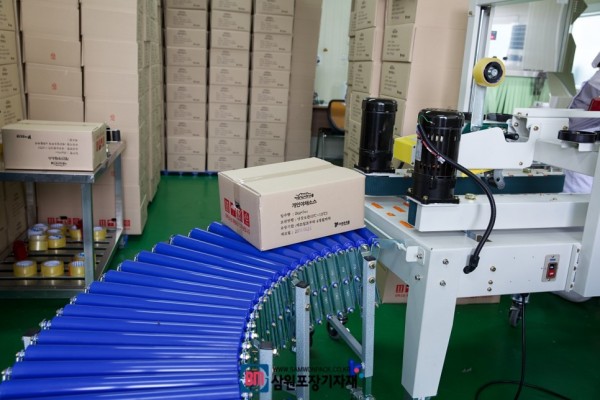 그러다보니 작업공간에 박스를 쌓아놓다 보니 좁아지게 되어 박스접기, 제품담기, 테이핑까지 한꺼번에 할수 있는 반자동탭핑기와 테이핑후 박스를 이동시켜주는 자바라를 셋트로 구입하셨습니다.