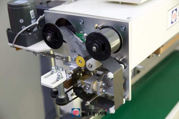액상제품이 담긴 지퍼백, 파우치의 상부 10mm까지 실링이 가능하며 테프론 벨트에 물려주면 실링후 냉각바를 거쳐 리본타입 먹지인쇄를 한후 배출됩니다.