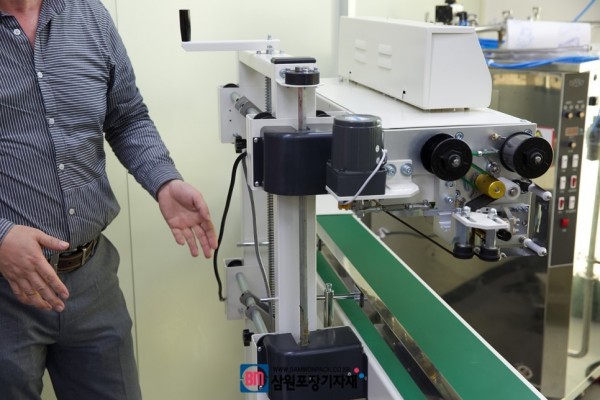상부에 장착된 핸들로 컨베어, 실링헤드를 동시, 각각 높이조절을 할수가 있습니다.