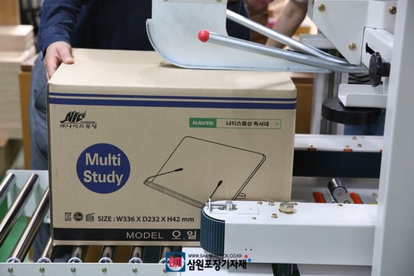 박스의 하부를 접어주고 제품을 담은 다음 진입시 박스면과 사이드는 진입과 동시에 탭핑기에서 접히게 되며, 마지막 박스날개만 접어주면 됩니다.