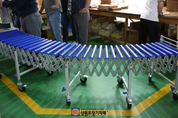 진입부에는 보조컨베어(무구동롤러)를 연결해서 박스를 올려놓고 제품담기, 박스 진입을 용이하게 할수 있습니다.(옵션)