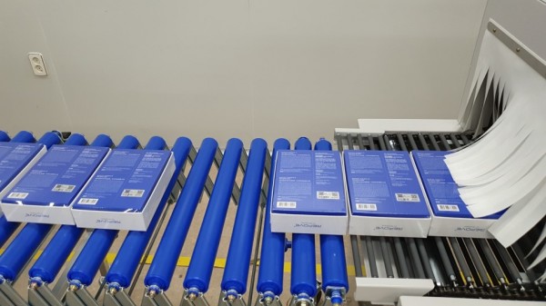 수축필름에 실링된 화장품 박스는 일정한 작업결과물로 수축터널에 공급되게 됩니다