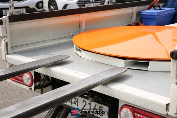 랩핑기는 생각보다 무게가 무겁지 않아서 이렇게 회전판의 홈을 통해 지게차로 쉽게 내릴수 있고 이동도 할수 있답니다.