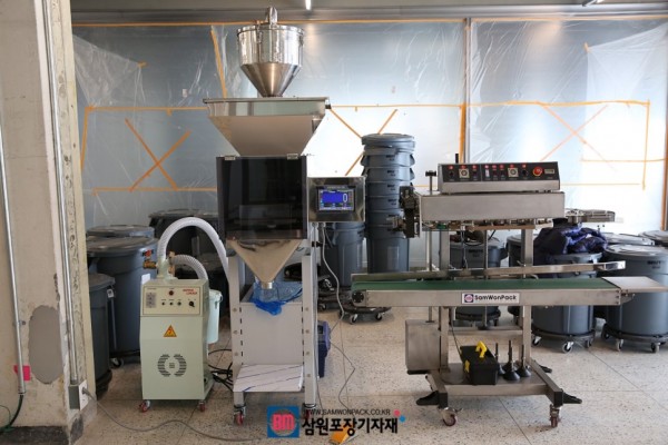 진공이송기(원두를 호퍼에 이송) -> 자동계량기(원두 계량후 파우치에 담기) -> 밴드실러(파우치 실링과 날인)