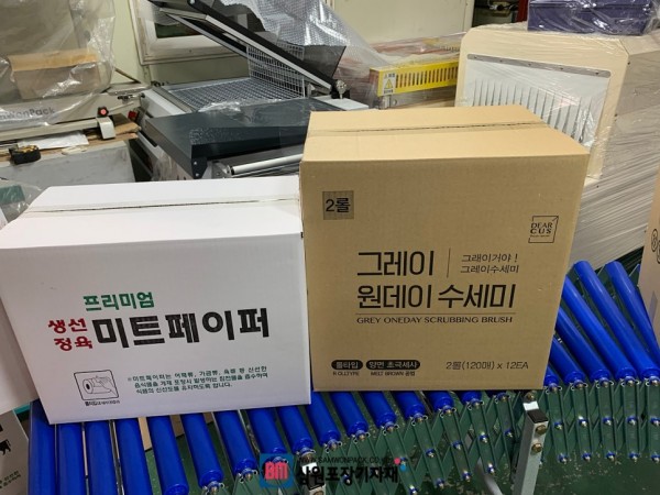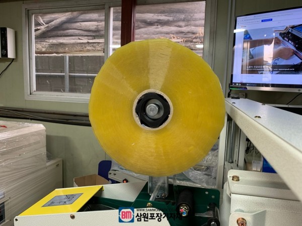 오른쪽에 하부 제함기가 있어서 박스의 아래부분을 접어주고 제품담기를 한후, 왼쪽으로 이동시키면 반자동탭핑기에 의해 박스를 테이핑해주는데요