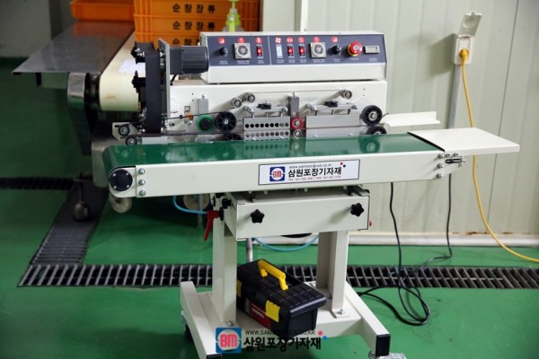 파우치를 눕혀서 작업하는 수평밴드실러로 실링과 날인을 동시에 작업하는 포장기계입니다