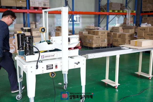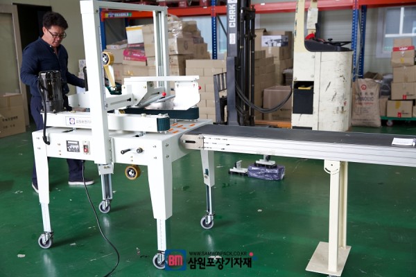 박스에 담긴 물건은 자동컨베어 끝단에 있는 탭핑기에 연결되게 됩니다.