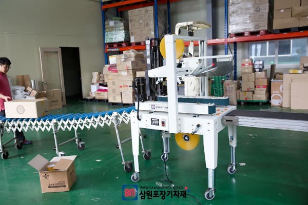 이렇게 자동컨베어의 배출구에서 자연스럽게 박스포장기계로 들어가면 박스의 상부가 접히면서 박스의 상하부가 자동으로 테이핑되게 됩니다.