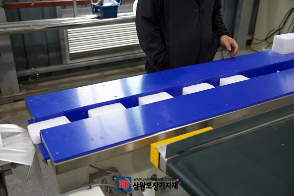 이렇게 삼면포장기의 하단에서 올라오는 포장지에 드라이아이스가 옮겨지면