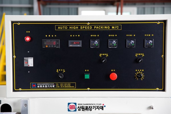 컨트롤패널은 필름의 길이, 센터실링, 엔드커터의 온도등을 조절할수 있으며 컨베어속도 및 생산수량 카운트까지 직관적인 조절이 가능합니다.