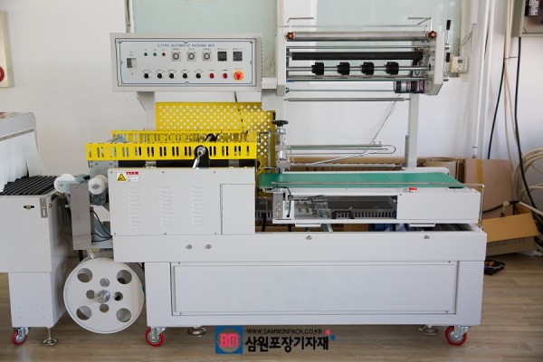 L실러와 수축터널로 이뤄진 수축포장기는 이렇게 작업을 자동으로 해주는 전자동수축포장기외에도 제품 투입후 작업자가 버튼으로 L씰러를 작동해서 실링하는 반자동수축포장기도 있으며
