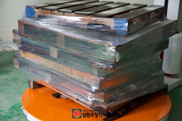 랩핑기, 랩포장기는 회전원판위에 파렛트를 올리면 자동으로 제품의 높이를 감지해서 아래부터 위까지 자동으로 랩핑해주는 파렛트랩핑기입니다.