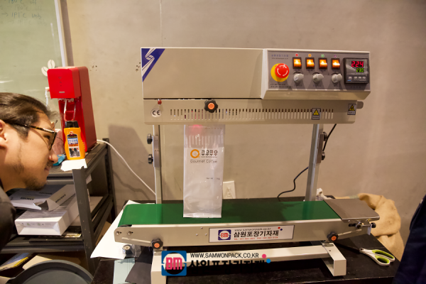 이렇게 정량 중량해서 배출된 원두는 파우치에 담겨져서 일명 실링기라 불리는 밴드실러로 실링, 날인등의 과정을 거쳐 비닐접착 및 제조일자, 유통기한, 까지 등의 인쇄가 되어 완성되게 됩니다.