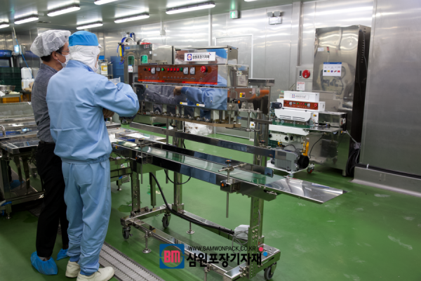 생산시설은 위생복과 마스크, 위생화까지 HACCP인증 공장답게 청결하고 위생적으로 운영되었는데요, 스텐레스로 제작된 수직형 밴드실러도 이런 작업환경에 잘어울리네요