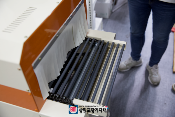 수축포장기는 수축필름을 제품에 씌우고 L실러로 재단한후에 수축터널을 지나면서 열풍에 의해 수축되어 포장하는 기계입니다