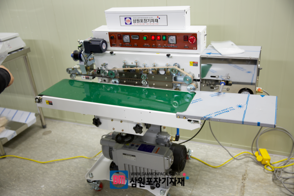포장필름을 흡기밸브에 넣고 진공흡착을 한후 실링밸트에 포장필름을 태우면 자동으로 실링과 인자가 됩니다.