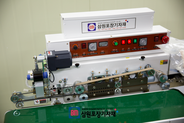 마지막으로 날인기의 "날짜와 제조월일"등의 글자를 채운후 장착한후 진공밴드실러를 작동하면 입구쪽에서 진공흡입후 실링과 날인 과정을 하게 됩니다 .