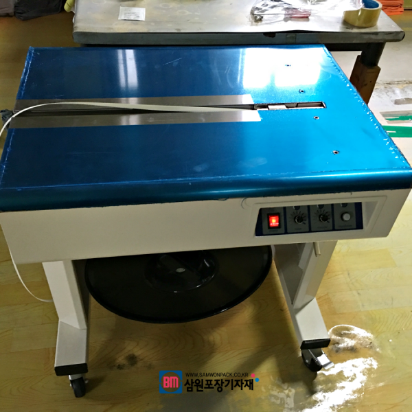 고상형 밴딩기로 작업물을 올려놓고 밴딩끈을 투입구에 넣어주면 자동으로 밴딩하는 반자동밴딩기입니다