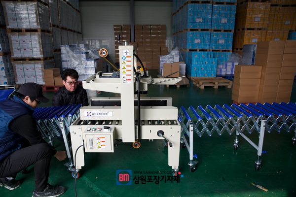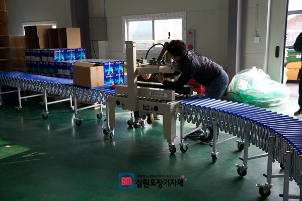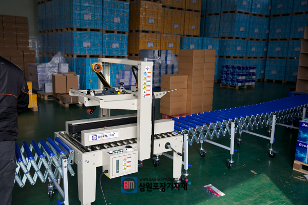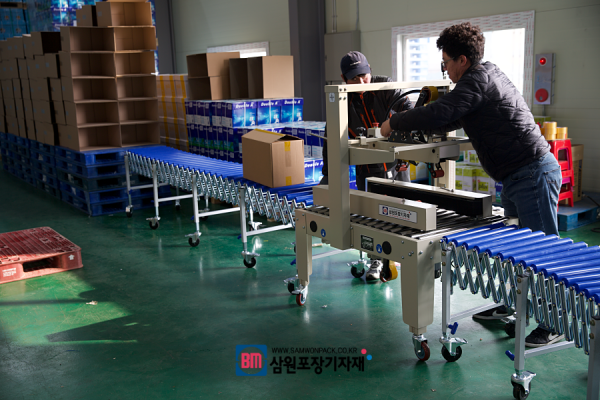 삼원포장에서는 기본 450mm 폭의 롤러가 달린 자바라(컨베어)를 공급드려서 다양한 박스 사이즈에 안정적으로 작업하실수 있습니다.