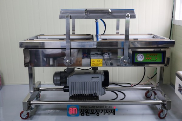 진공포장기중 복식진공포장기는 두개의 챔버를 번갈아가면 사용할수 있기 때문에 작업생산능력이 우수한 포장기계입니다.