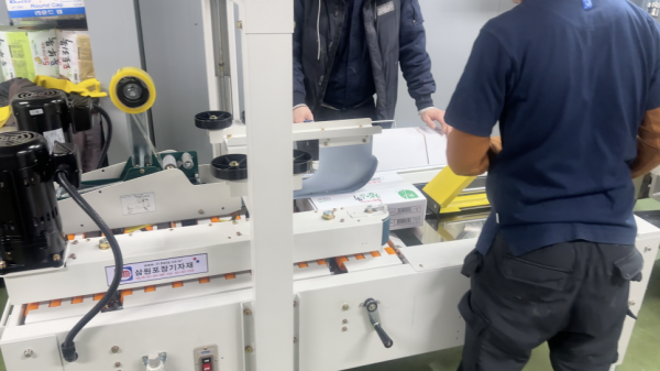 박스포장기계의 작동 방식도 간편한데요, 박스를 넣고 센서를 터치하면 기계가 자동으로 박스의 하부를 접고, 제품을 담은 후에 스위치를 누르면 공압식 컴프레서의 푸쉬에 의해 박스가 전방으로 이동하면서 상하 테이핑이 이루어지고 박스 포장이 완성됩니다.
