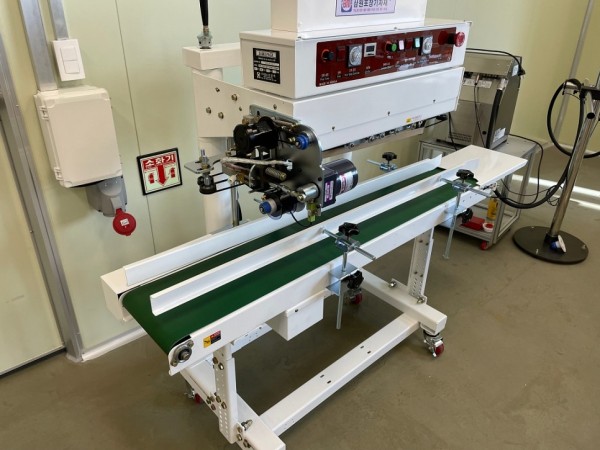 파우치의 크기에 따라 높이조절이 가능하며 씰링온도 및 컨베이어 속도 조절로 연속으로 실링작업이 가능하며