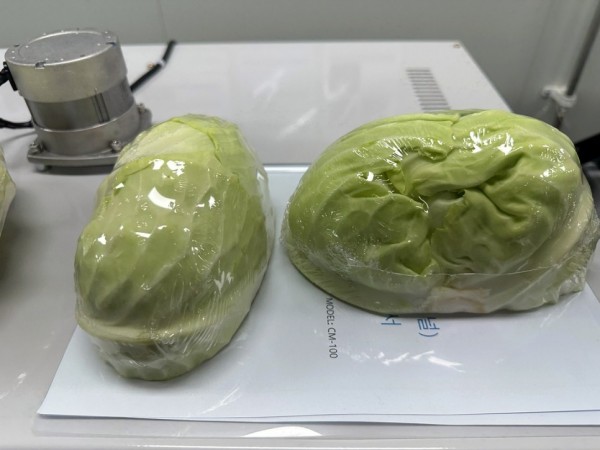 원형 형태의 한개의 양배추나 반으로 자른 양배추든지 수축포장이 가능하며 투명한 비닐이 양배추 모양 그대로 수축되고 포장도 되니