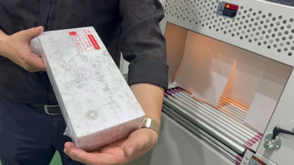 수축포장은 제품 위에 필름을 덮은 후 열을 가해 필름이 제품에 딱 밀착되도록 마감하는 방식입니다.