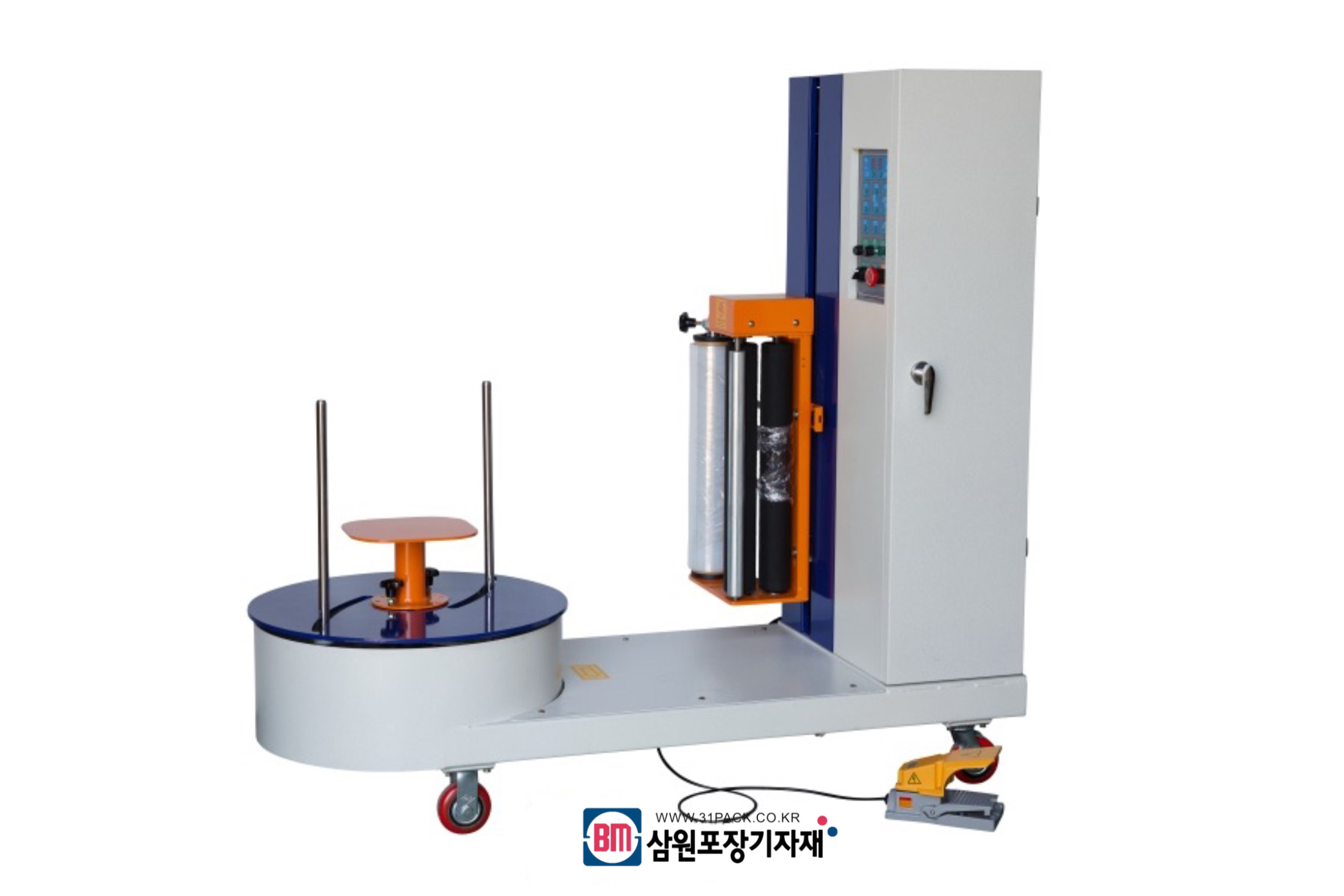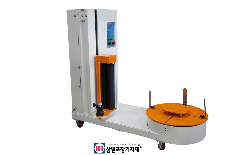 턴테이블 위에 박스제품을 올려놓으면 상부 프레스가 박스를 고정하고 랩포장을 진행하며, 셋팅한 횟수만큼 자동으로 회전해 랩핑 할 수 있으며 풋스위치로 작동도 가능합니다.
