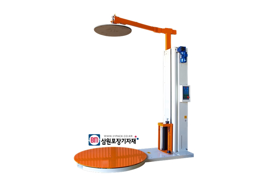 파렛트위 제품의 상,하 높이를 자동감지하여(센서장착) 원하는 횟수만큼 자동으로 랩핑해주는 파렛트랩핑기, 랩핑기는