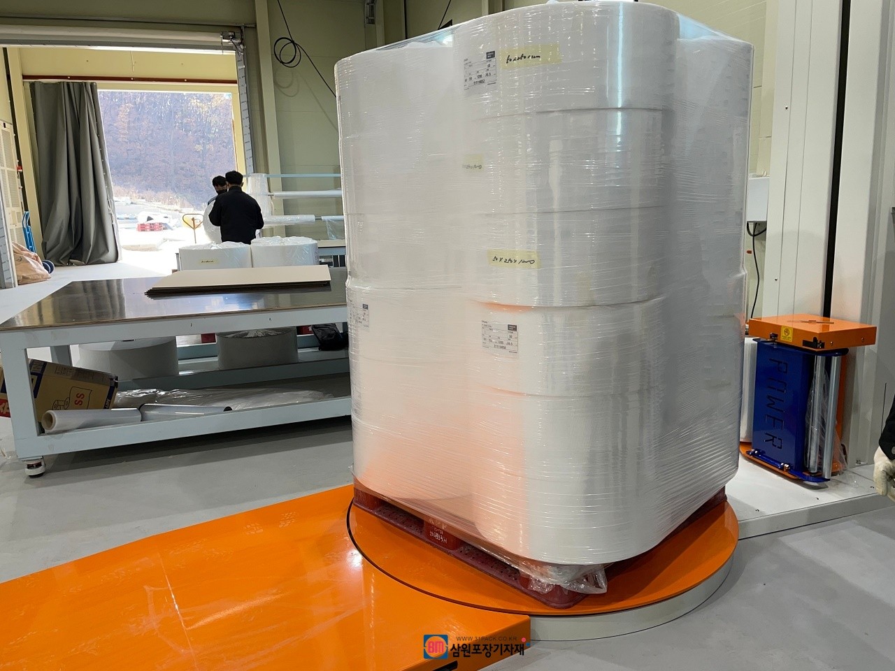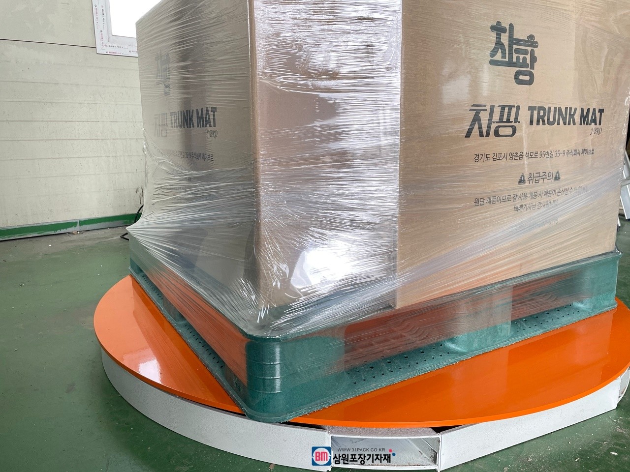 파렛트위 제품의 상,하 높이를 자동감지하여(센서장착) 원하는 횟수만큼 자동으로 랩핑해주는 파렛트랩핑기, 랩핑기...